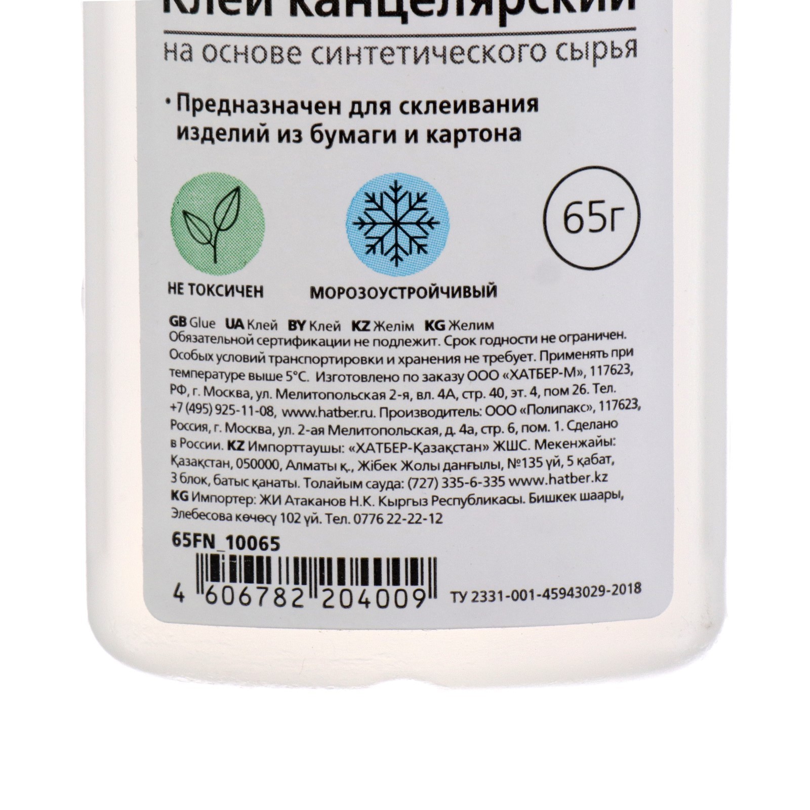 Клей канцелярский на синтетической основе предназначен для склеивания бумаги и картона. Изготовлен по новейшей современной технологии с использованием компонентов, обеспечивающих безопасность применения. После высыхания не оставляет следов, после замораживания и размораживания не теряет своих свойств. Конусообразный дозатор с фиксированным колпачком обеспечивает легкое использование и экономичный расход клея. Объем 65 г.