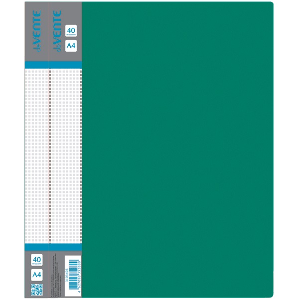 На корешке имеется карман для маркировки содержимого. Папка изготовлена из качественного пластика толщиной 0,6 мм с фактурой «песок», ширина корешка составляет 25 мм. Содержит 40 вкладышей, позволяющих хранить документы формата А4 и обеспечивающих их надежную защиту от попадания влаги, пыли и прочих повреждений.