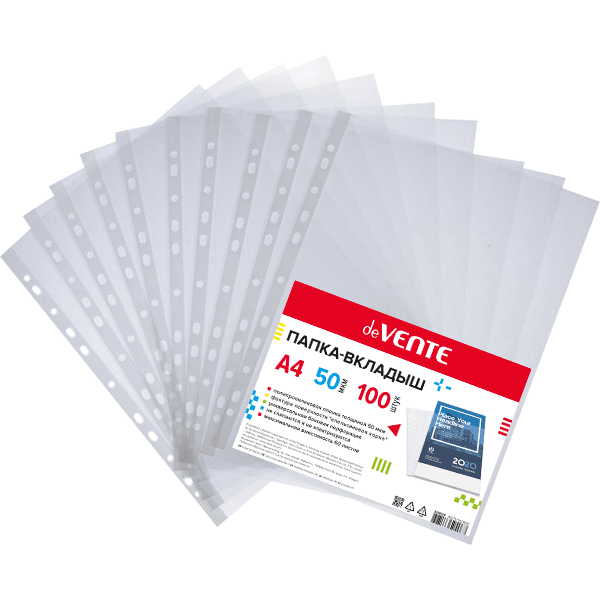 Перфорированные папки-файлы deVENTE предназначены для хранения документов в папке с любым кольцевым механизмом или скоросшивателем.