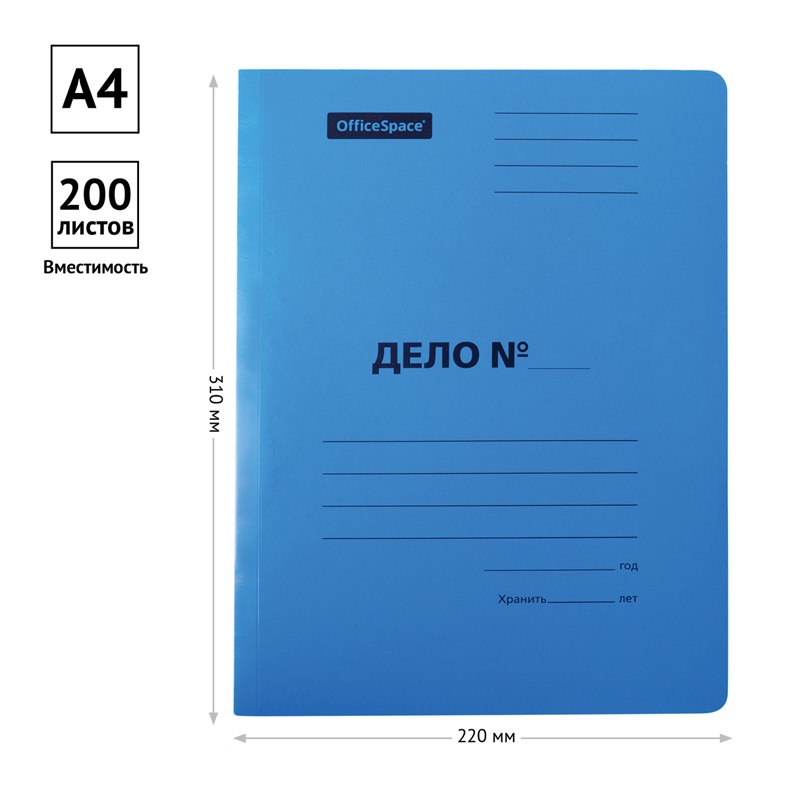 Подходит для документов формата А4 и меньше. Изготовлен из мелованного картона плотностью 300 г/м2. Оснащен металлическим механизмом сшивания. Вмещает до 200 листов стандартной плотности. Имеет надпись "Дело №" на обложке.