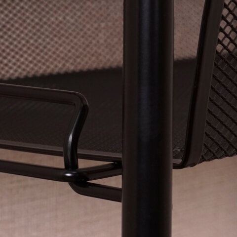 Этажерка выполнена из прочной металлической трубы 14 мм и стального листа в мелкую сетку.