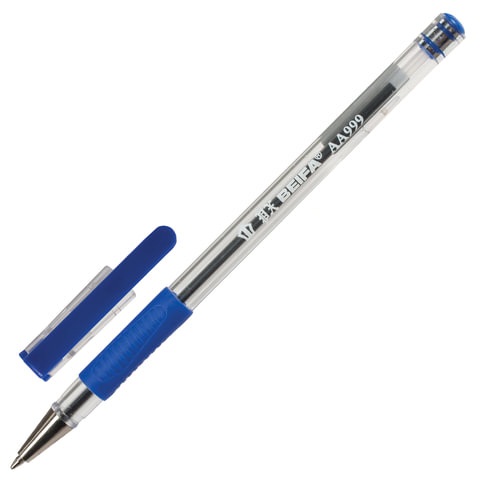 Удобная шариковая ручка BEIFA в пластиковом прозрачном круглом корпусе с деталями в цвет чернил и резиновым держателем в зоне захвата.