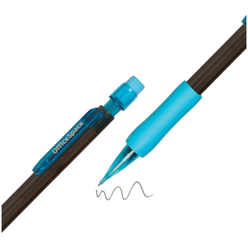 Карандаш с нажимным механизмом OfficeSpace заправлен грифелем HB, всегда заточен, готов к работе и дает ровную линию 0,7 мм. Длина карандаша 15,5 см, диаметр 8,5 мм, форма корпуса – шестигранная. Карандаш снабжён резиновым грипом пяти различных цветов, предотвращающим скольжение пальцев при использовании, и встроенным ластиком, при нажатии на который происходит подача грифеля.